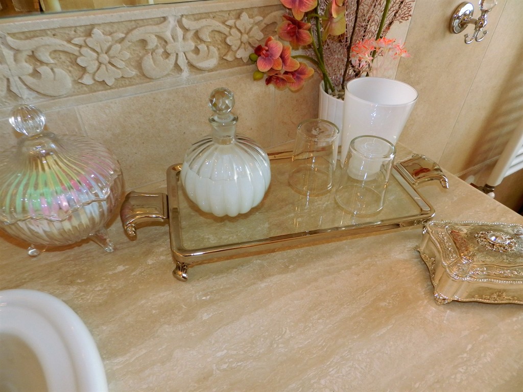This unique exclusive queen suite is a romantic room with two windows overlooking the valley and the mountains. The king size half poster bed with its rich fabrics reminds one of long lost times. An enormous crystal chandelier and an authentic stone fireplace, gives this room a opulent atmosphere and a queenly feel. The bathroom also features crystal chandeliers and a free standing claw foot bathtub as well as the soft tones of travertine marble. The room has a flat screen T.V. an espresso machine and a mini fridge.The antique oil paintings and furniture evoke past classical times.